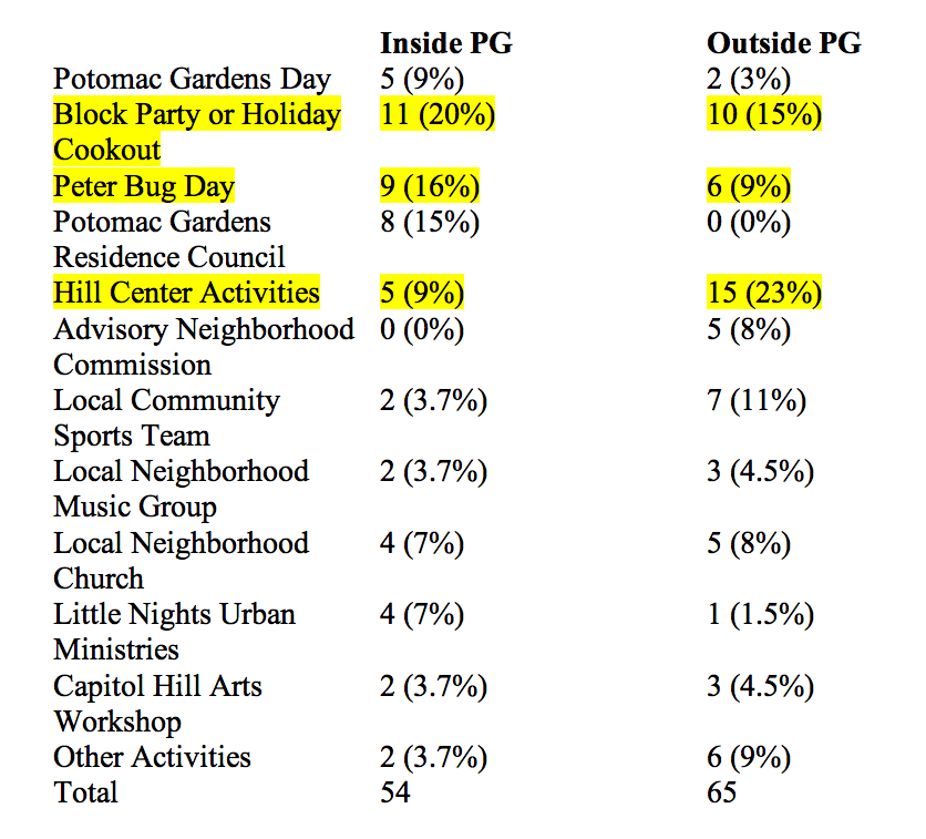 Both groups attended block parties and holiday cookouts. While those inside were slightly more likely to attend Peter Bug Day, those outside were much more likely to attend Hill Center activities. Many people did not participate in any of these activities.